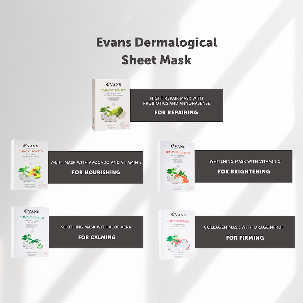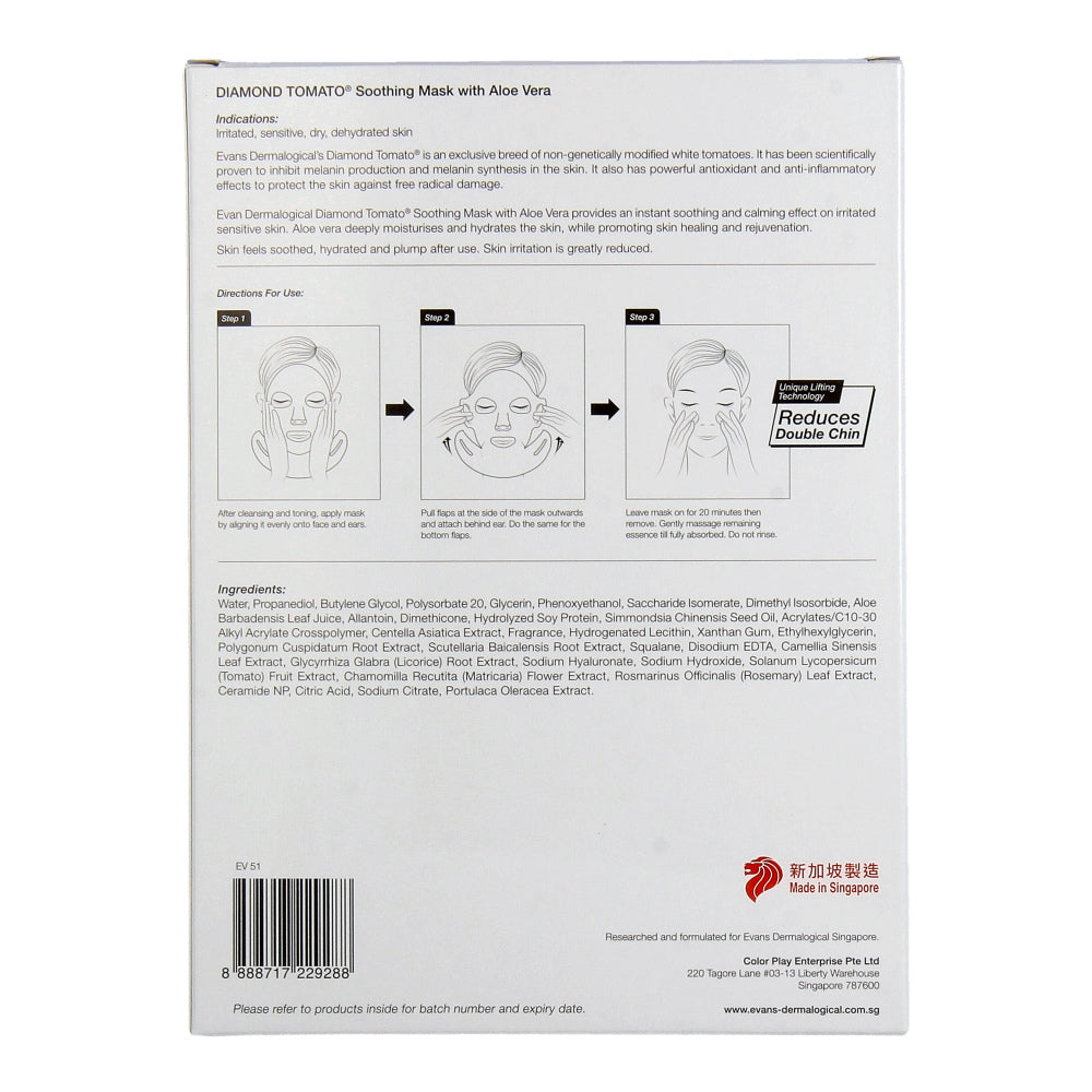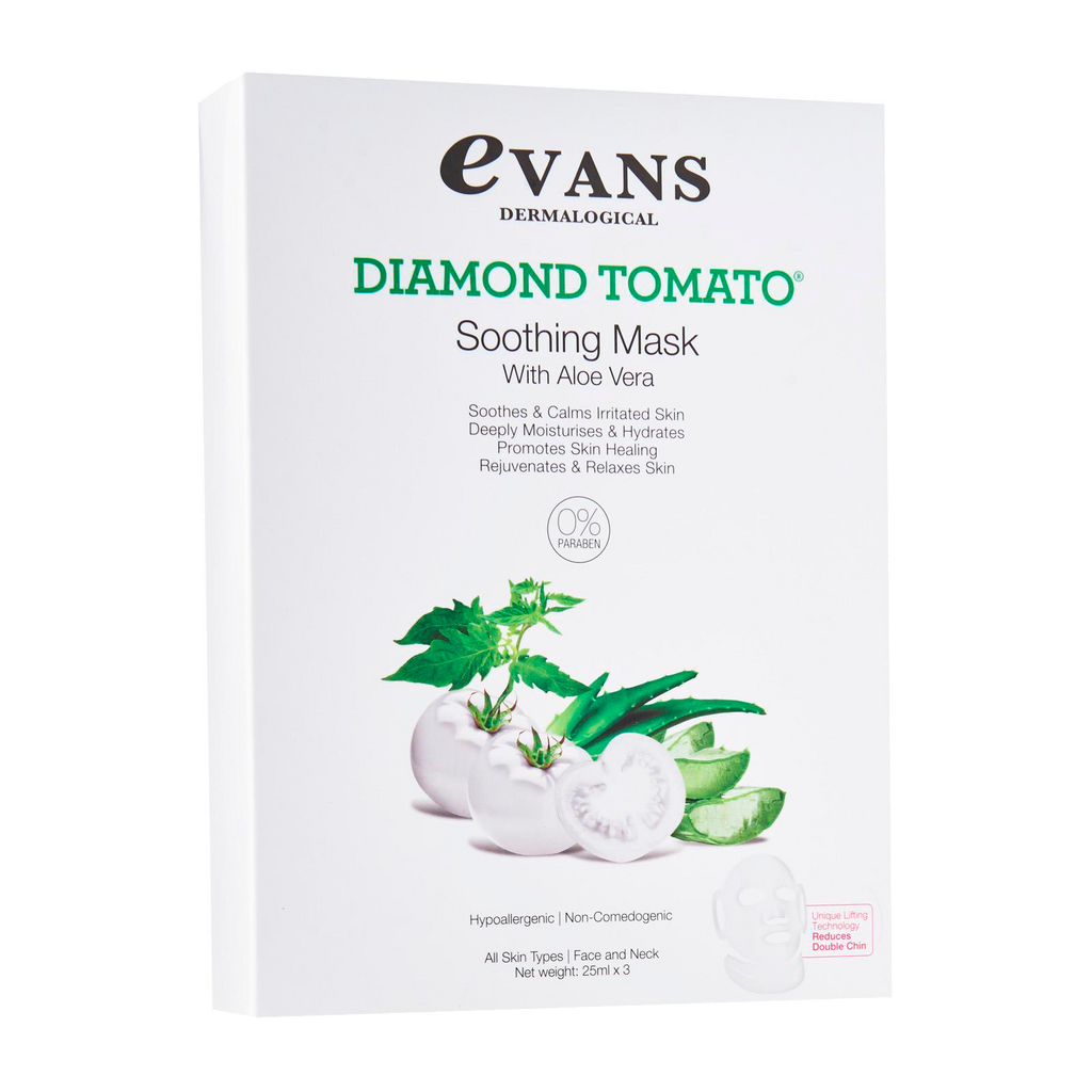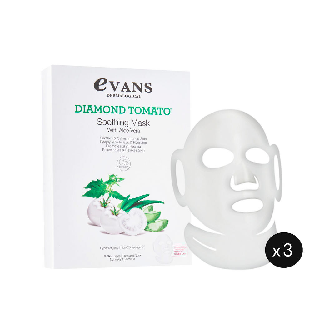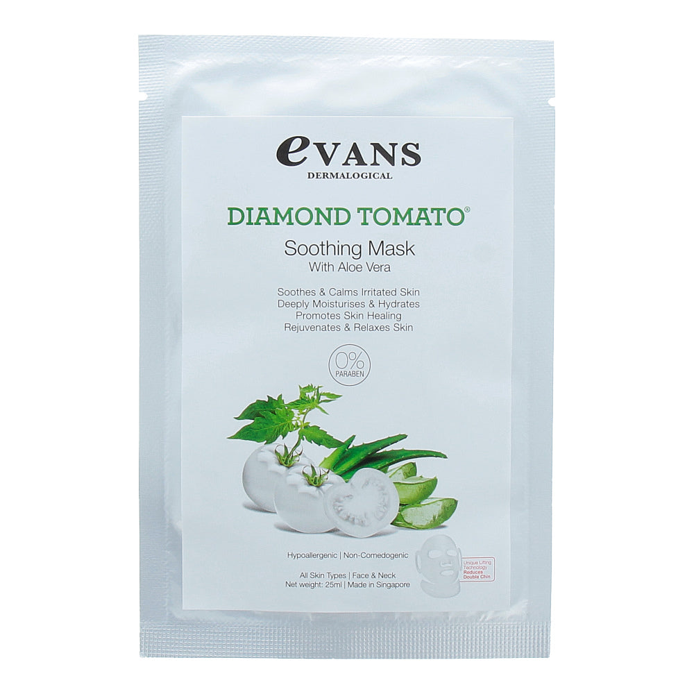 Evans Dermalogical Diamond Tomato Soothing Mask with Aloe Vera helps soothe and calm irritated skin while lifting and firming, thanks to its unique V-lift technology.
