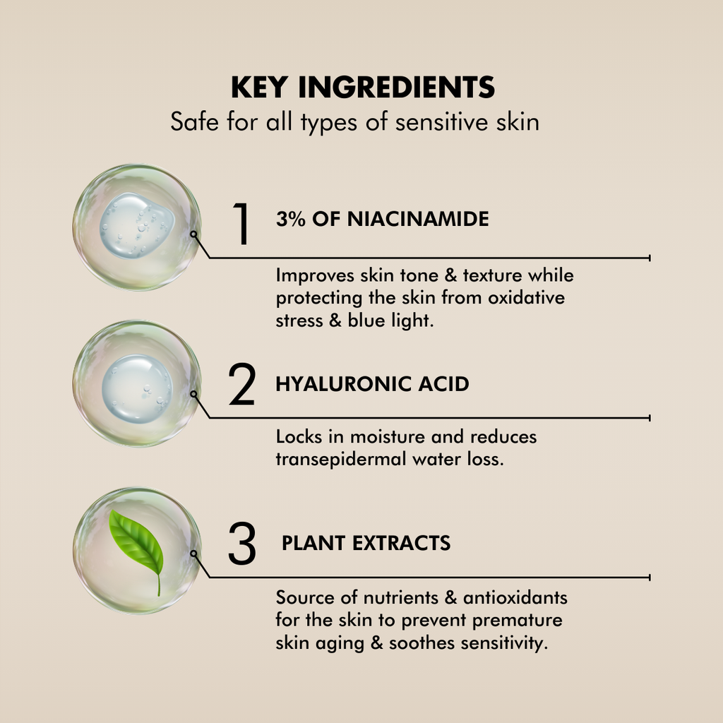 1) 3% of Niacinamide: Improves skin tone and texture while protecting the skin from oxidative stress and blue light.