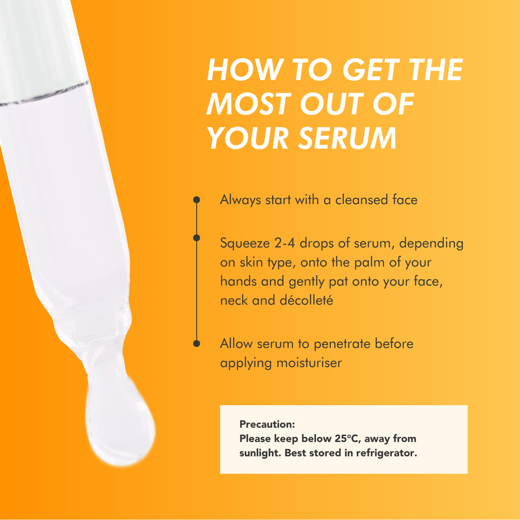 After cleansing and toning skin, apply a 3-4 drops of serum onto skin. Gently massage in over the face and neck.