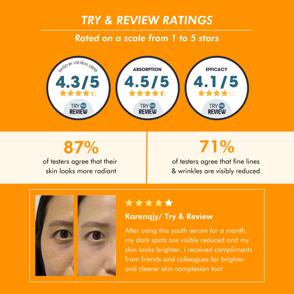 Noticed that have slightly different in my skin tone after 14days used. Felt my skin become more hydrated and more radiant look. The textures very lightweight one or two drops can apply to own face super fast absorption too.