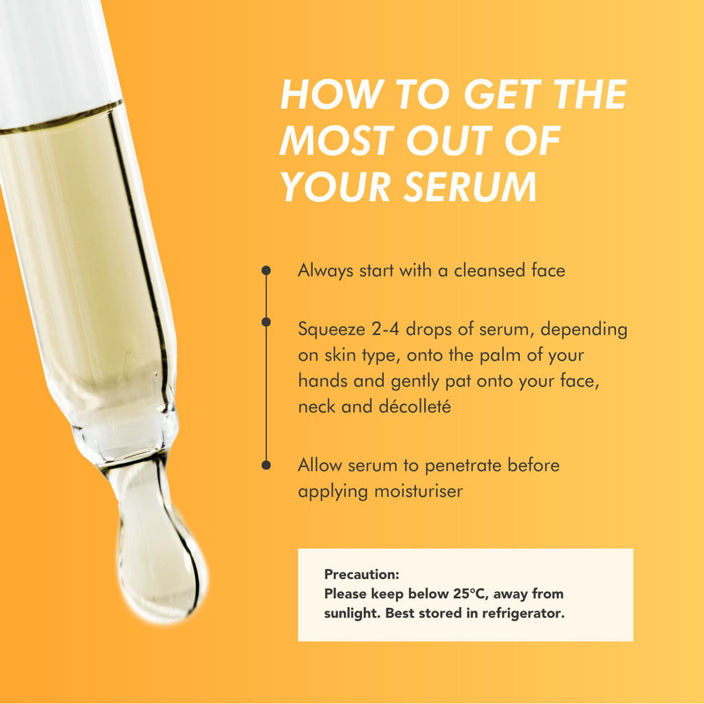 After cleansing, squeeze 3-4 drops of serum onto hands. Apply evenly to the face and neck. Allow serum to penetrate before applying moisturiser. Use morning and night for 1 month to see results. For best results, continue treatment for at least 3 months. Always use a broad-spectrum SPF in the morning.