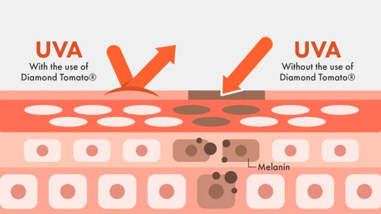 Diamond Tomato® inhibits the formation of melanin, a natural skin pigment produced by melanocyte cells. Melanocytes are triggered by UVA rays, leading to increased melanin production and the formation of sunspots or hyperpigmentation.